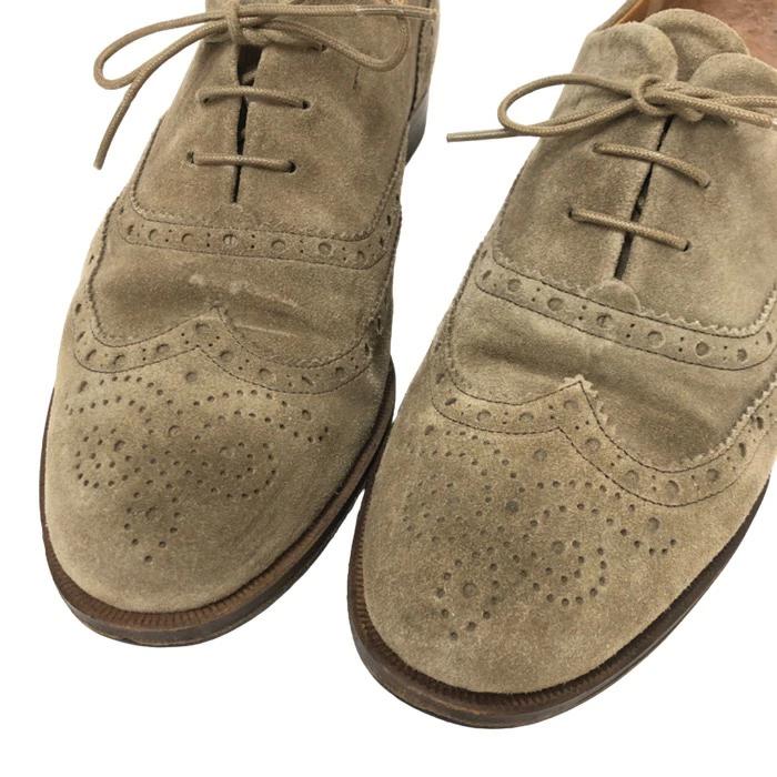 【管理番号】 015879w【ブランド名】ヒロフ【商品名】【アイテム】スエード ウィングチップ ドレスシューズ ビジネスシューズ レディース【型番】【サイズ】 サイズ表記 24 1/2 アウトソール実寸 約26.8cm ヒール約2cm【色・柄】 カーキ【素材】 スエード【附属品】【外観ランク】 Bランク【商品補足説明】スエードに毛羽立ち・擦れあり。両アウトソールに減りあり。つま先に擦れあり。