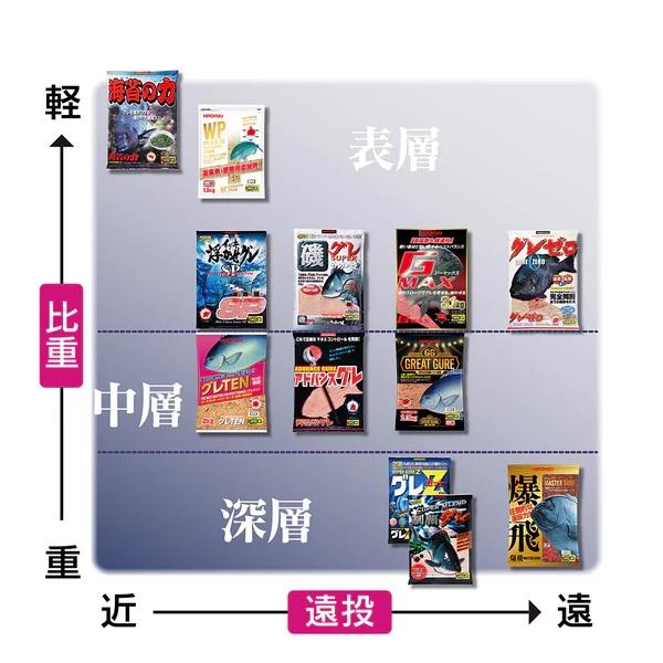 グレ用ブレンド材のニューフェイス!「高拡散&超遠投」「容量3.1k」軽い素材と粗い粒子のベストバランスにより、高い拡散性と超遠投性能を備えています。視認性に優れた赤いスロープが高い集魚力を誇り、グレを寄せて食わせます。 内容量:約3.1kg 対象魚 :グレ ※実物と色が違って見える場合があります。あらかじめご了承下さい。