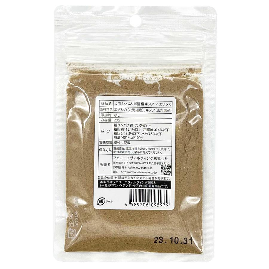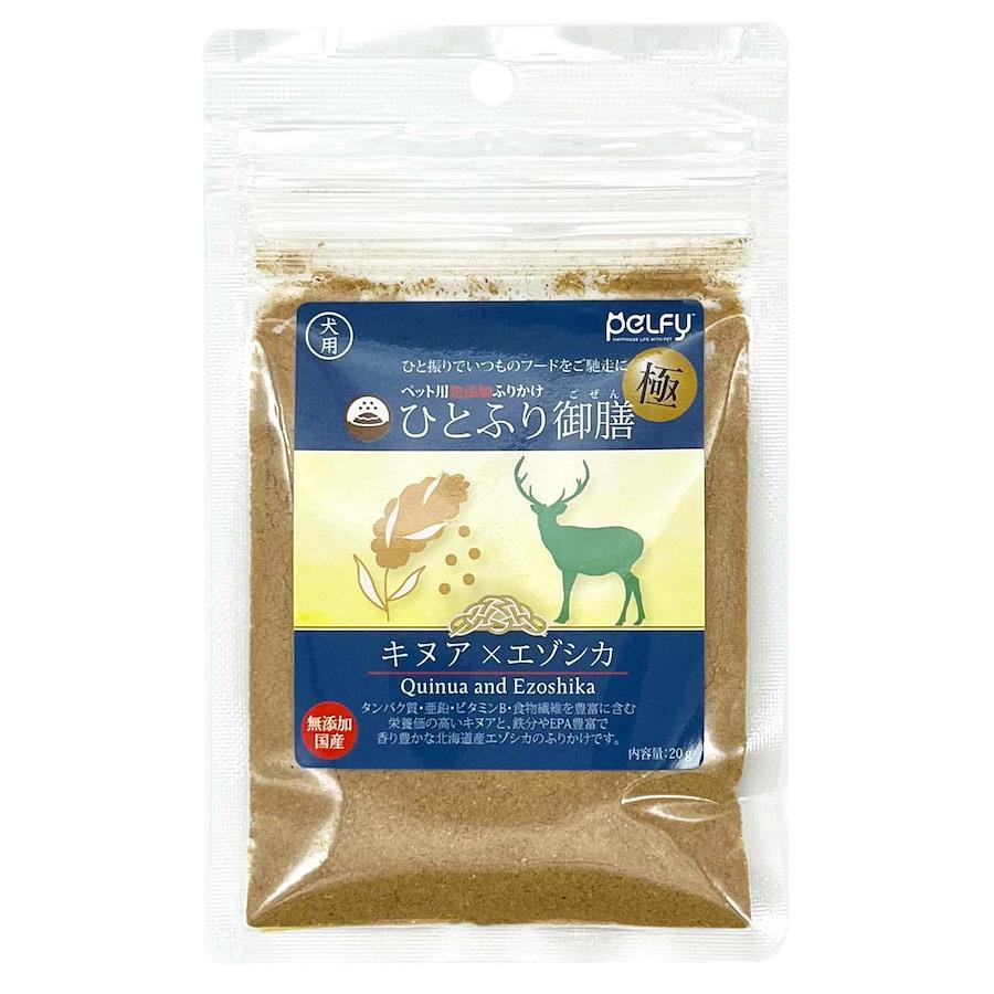 ひと振りでいつものフードをご馳走に! ペット用無添加ふりかけ「ひとふり御膳」 低脂肪で鉄分やEPAが豊富、香り豊かな北海道産エゾシカのふりかけです。 国産・無添加で安心・安全。きめ細かい粒がフードに絡みやすく、無駄なく使用できます。 いつものごはんにそのままトッピングして与えてください。 「ひとふり御膳」の天然の旨みと至高の香りはそのままに、 高い栄養価からスーパーフードとして注目されているキヌア をプラス。 亜鉛やビタミンB、食物繊維、植物性タンパク質を 豊富に含み、健康な身体を維持するのに必要な必須アミノ 酸もすべてバランスよく含んでいます。 いつものフードにひとふりするだけ、食事からペットの健康を支えます。安心の無添加、国内加工でお届け。 至極のふりかけで、いつもの食事をさらに美味しく健康に。 〇こんなワンちゃんにおすすめ ・食欲のない時に ・普段の食事の栄養補助に ・好き嫌いのあるワンちゃんの手作りごはんの補助に ・薬をフードに混ぜて与えたい時に 【原材料】エゾシカ(北海道産)、キヌア(山梨県産) ※粉末に混ざっている細長い欠片は筋肉を細かく砕いた後の繊維です。粉末と同成分ですのでそのまま与えていただいて問題ございません。 【成分】粗タンパク質72.0%以上、粗脂肪15.1%以上、粗繊維質0.4%以下、粗灰分3.3%以下、水分3.5%以下、熱量401kcal/100g 【保存方法】直射日光、高温多湿を避けて保管してください。 開封後は密閉し、早めに与えてください。