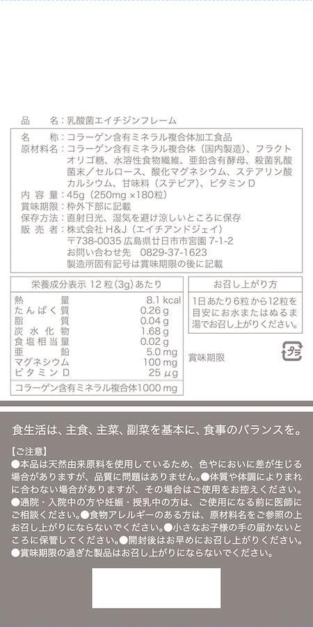 ■サイズ:??19x10x1cm;60gDr. シリーズ「エイチジンフレーム」 乳酸菌エイチジンシリーズから、Dr.シリーズが登場。選び抜かれた成分に加え“HJ1乳酸菌”を配合したシリーズ。その中でもエイチジンフレームはコラーゲン含有ミネラル複合体(プロテタイト)などの成分をプラスした特別な乳酸菌サプリメント。錠剤タイプなので、計量や持ち運びが簡単です。水またはぬるま湯でお飲みください。 乳酸菌エイチジンシリーズから、Dr.シリーズが登場。選び抜かれた成分に加え“HJ1乳酸菌”を配合したシリーズ。その中でもエイチジンフレームはコラーゲン含有ミネラル複合体(プロテタイト)などの成分をプラスした特別な乳酸菌サプリメント。錠剤タイプなので、計量や持ち運びが簡単です。水またはぬるま湯でお飲みください。 一日あたり6粒を目安に水またはぬるま湯でお召し上がりください。 ■重要なお知らせ安全上のお知らせ通院・入院中の方や妊娠・授乳中の方は医師にご相談ください。原材料・成分コラーゲン含有ミネラル複合体(国内製造) フラクトオリゴ糖 水溶性食物繊維 亜鉛含有酵母 殺菌乳酸菌末 セルロース 酸化マグネシウム ステアリン酸カルシウム 甘味料(ステビア) ビタミンD使用方法おやすみ前に水またはぬるま湯でお飲みください。