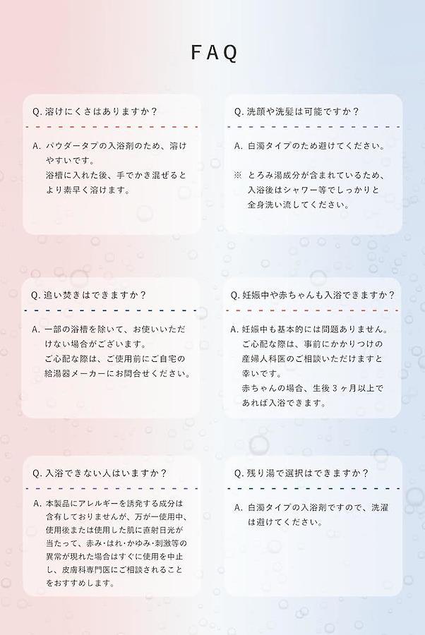 全成分 :炭酸水素Na、炭酸Na、無水クエン酸、乳酸、酸化Ti、PEG20000、ポリアクリル酸Na、高重合PEG、香料、PEG6000、グリシン、海水乾燥物、無水ケイ酸、赤106、青1、加水分解コラーゲン末、ラベンダーエキス(1)、チャエキス(1)、ヒアルロン酸ナトリウム(2)