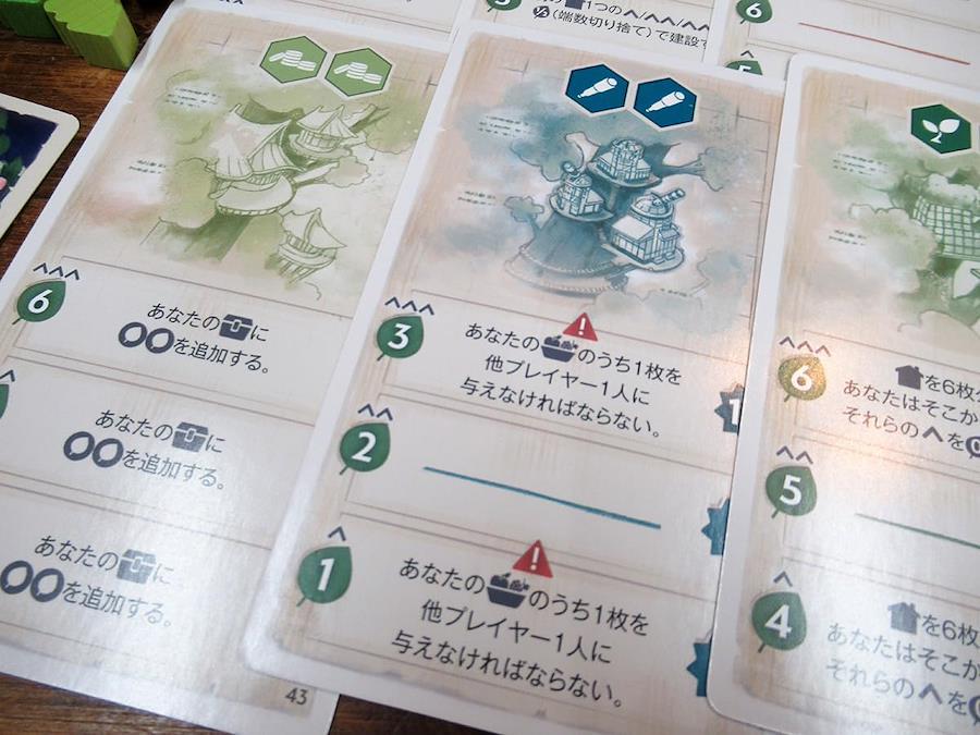 建設できるギルドは3段階のレベルがあり、最初のレベルから建設し始め、次のレベルへと建設を進めることができ、3レベル目を建設すると「完成」します。ギルドがレベルに応じたレベル効果を持つ場合、建設時にその効果を使用できたり、そのレベルであるうちは永続効果をもたらしたりします。ただし、建設途中のギルドは3つまでしか保持できず、いずれかのプレイヤーが既定の数の建物を完成させるとゲームは終了となってしまい、かつ最終的には建設した各建物のレベルに応じた点数で勝敗が決まるため(もちろん完成していれば一番点数が高い)、何をどのような順で建設するのか、点数と効果を考慮する必要があります。しかも使用するカードセットは6つのギルドから4つを選んで使用するため組み合わせによって展開も多様なものとなるでしょう。