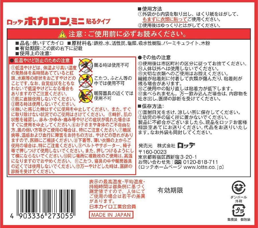 商品紹介 みんな笑顔になるあったかさ! 貼りたいところにピタっと! 腰や肩などの衣類の上から貼るミニタイプ! お買い求めやすい30個入り! 原材料・成分 鉄粉、水、活性炭、塩類、バーミキュライト、吸水性樹脂、木粉 使用方法 (1)外袋から内袋を取り出し、はくり紙をはがして、もまずに衣類の上から粘着剤を肌側に向け、貼ってご使用ください。(2)発熱が終了したらすぐにはがしてください。放置するとはがれにくくなります。 安全警告 ・低温やけどにご注意ください。・眠るときの使用は不可。・こたつ、ふとん等の中での使用は不可。・暖房器具の近くでの使用は不可。 続きを見る ズレない、かさばらない、目立たない。 原材料: 鉄粉、水、活性炭、塩類、バーミキュライト、吸水性樹脂、木粉 ブラント名:ホカロン メーカー名: ロッテ 原産国名: 日本