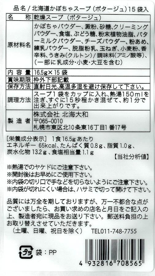15袋入りのお徳用サイズです。北海道の甘みのあるカボチャを贅沢に使い、濃厚でカボチャの味が生きた北海道らしいスープです。クルトン入りです。
