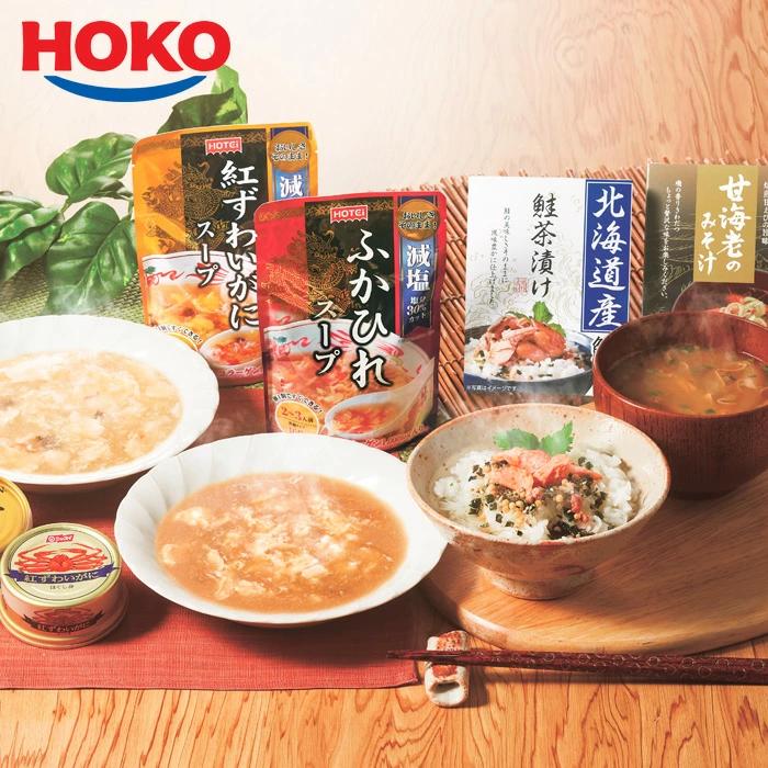 ふかひれスープ、紅ずわいがにスープ各160g、紅ずわいがにほぐし身55g×各2、鮪油漬フレーク70g、甘海老みそ汁(7.5g×3袋)、北海道産鮭茶漬け(4g×3袋)×各1【乳、小麦、えび、かに】