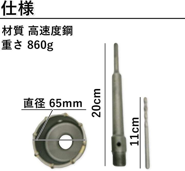 ・「サイズ」コアドリル 直径 65mm 他図参照 「重さ」200g 「材質」高速度鋼 「色」銀(シルバー) 「付属品」コアドリルx1、アダプターx1、ドリルビットx1