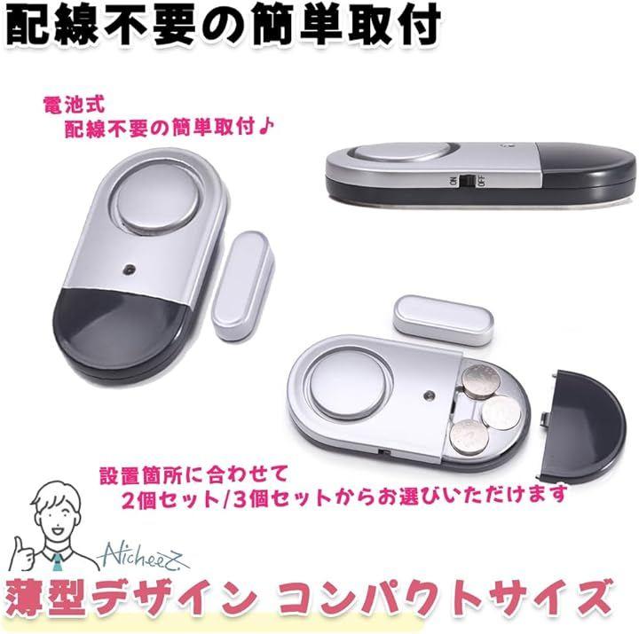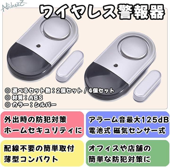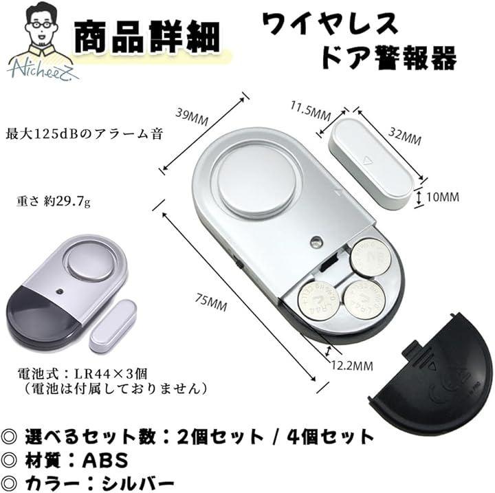 「商品内容」ワイヤレスドア警報器(2個セット/4個セット) 材質:ABS カラー:シルバー 本体サイズ:縦/約7.5cm 横/約3.9cm 厚さ/約1.2cm 最大125dB *LR44電池3個使用(電池は付属しません)