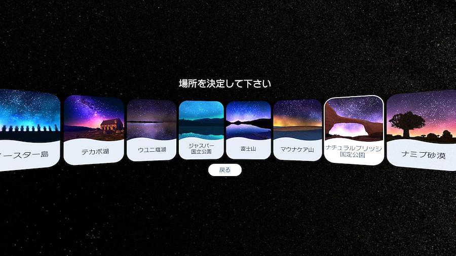 美しすぎる絶景星空スポットとして世界的に知られたテカポ湖(ニュージーランド)やマウナケア山(ハワイ)、ウユニ湖(ボリビア)、ジャスパー国立公園(カナダ)など、行きたくても行けない聖地をVRで訪れることができます。日本一の星空とも称される阿智村(長野県)や、ナチュラルブリッジ国定公園(ユタ州)、ナミブ砂漠(アフリカ)など、奇跡のように美しい星空が見られるスポットも新たに追加されました。