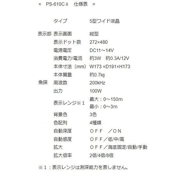 コンパクトなサイズとリーズナブルな価格、さらに使いやすい操作で、魚探がはじめての方でも安心して使うことができるモデルです。 PS-610C2は液晶のフロントパネルにガラスパネルを採用したことで視認性が向上しました。また空気層がない密着構造で結露もしません。 ※仕様につきましては2枚目以降の画像を確認してください。 セット内容:PS-610C本体(カバー付き)、振動子 TD04A(3m-3p)、トランサム金具、BMO製バッテリーパック(専用チャージャー付き) ※実物と色が違って見える場合があります。あらかじめご了承下さい。