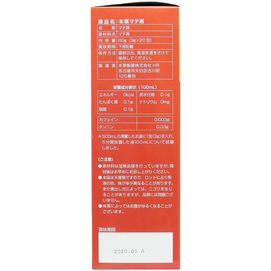 【栄養成分表示(100mL)】エネルギー・・・0kcaLたんぱく質・・0.1g脂質・・・0.1g炭水化物・・・0.1gナトリウム・・・0mgカフェイン・・・0.003gタンニン・・・0.3g※栄養成分表示について500mLの沸騰したお湯に1包(3g)を入れ、5分間放置した液100mLについて試験しました。