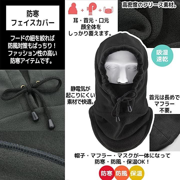 ・-10℃の極寒地でも高密度なフリース素材が耳まで覆い、フードの紐をキュッと絞れば防風対策もばっちり。