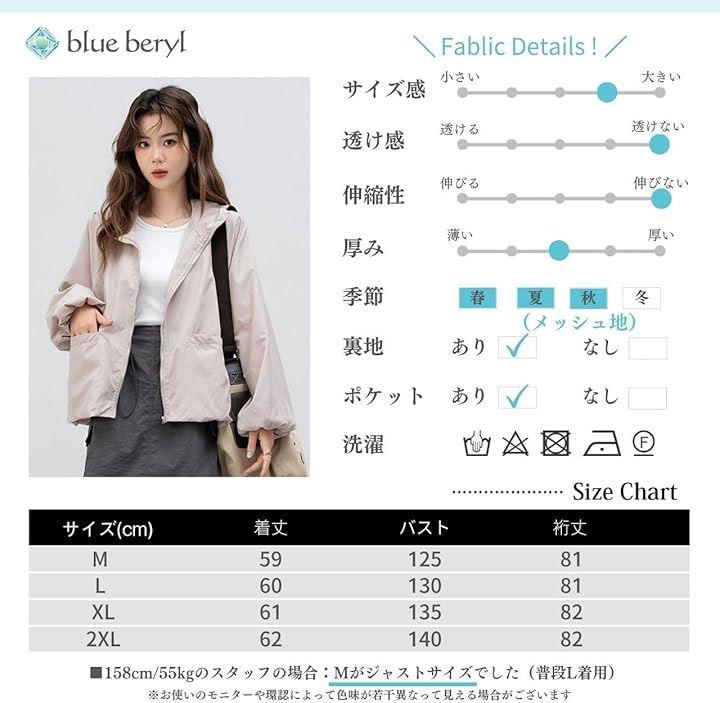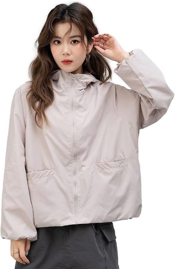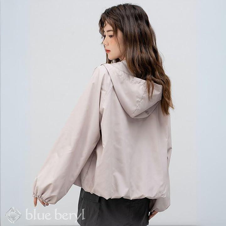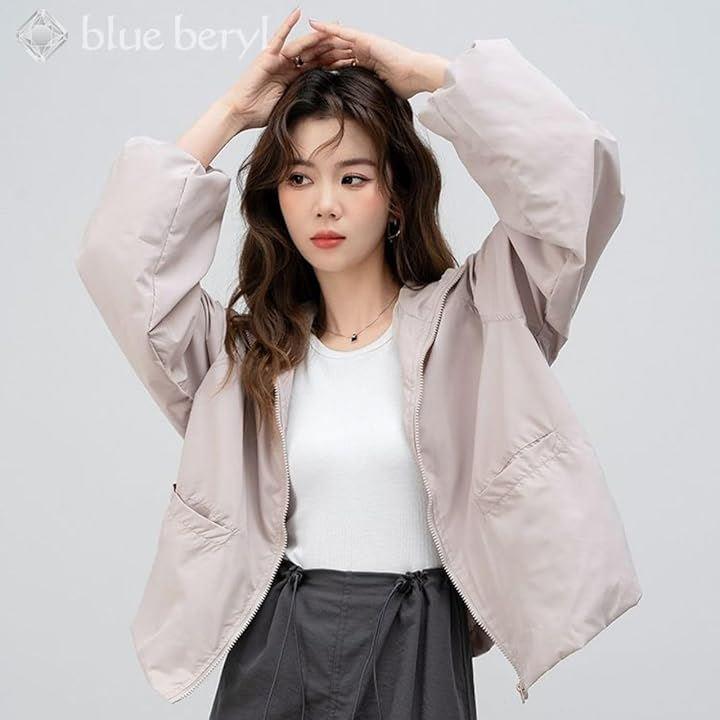 Hooded zip-up blouson for women, lightweight outerwear, UV protection, puff sleeves, stand-up collar, loose fit, lined, BB074