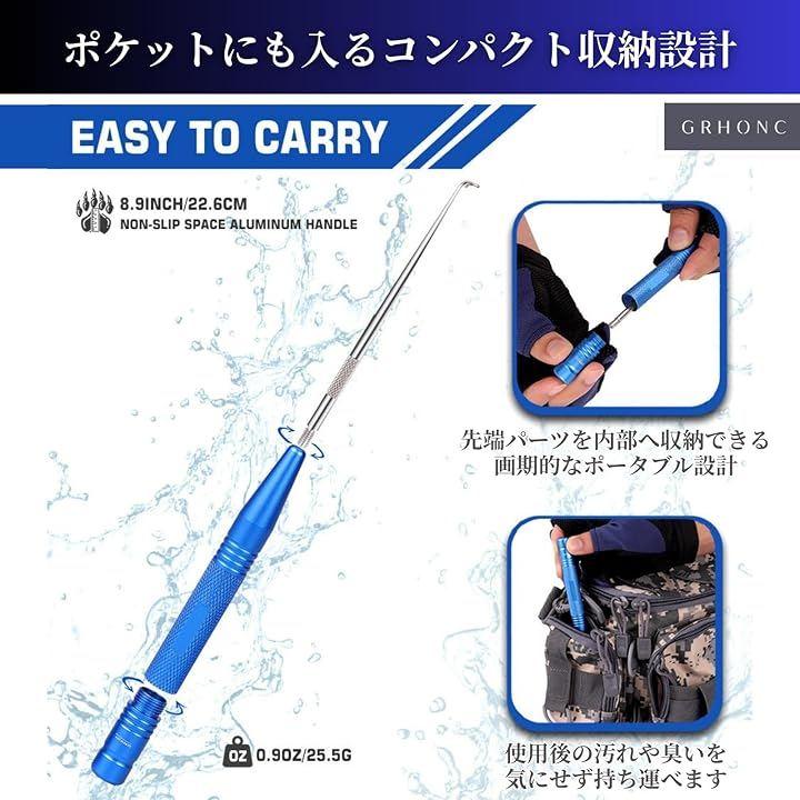 「カラー」ブルー「サイズ」全長 約22.2cm(先端収納時 約12.5cm)/ 重量 約26g「素材」スペースアルミニウム(ハンドル)、ステンレス(先端部)「機能」ネジ式先端収納構造 / マグネット内蔵(底部) / スパイラルラインガイド / 滑り止めローレット加工「利用シーン」堤防釣り、アジング、メバリング、サビキ釣り、渓流釣り、管理釣り場など