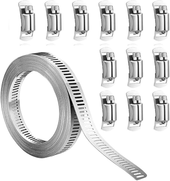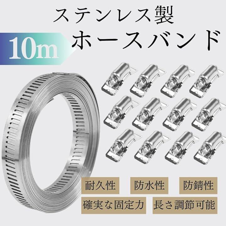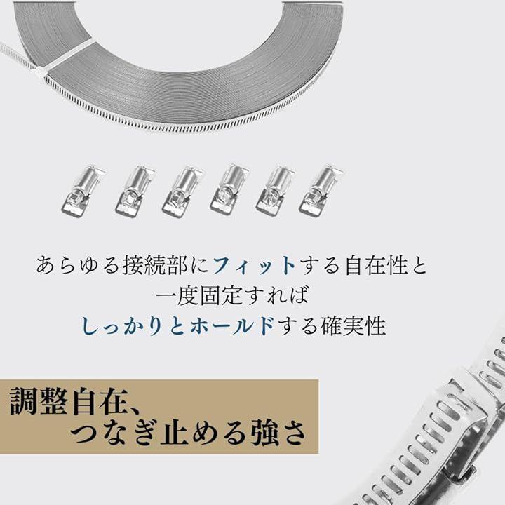 「調整自在、つなぎ止める強さ」10mステンレスホースバンド、ジッパーファスナー12個付き。