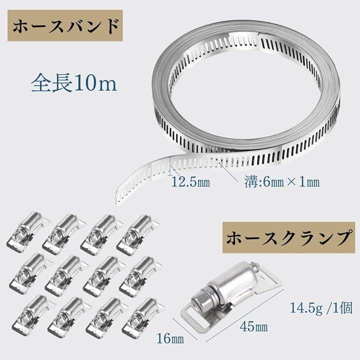 「サイズ」ホースバンド バンド幅:12.5mm 長さ:10m バンドの溝:6mm x 1mm バンド厚み:0.6mm クランプサイズ:16mm x 45mm 重さ:1個14.5g 12個入り