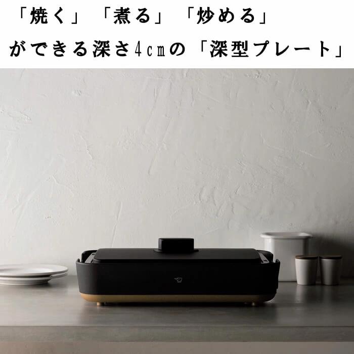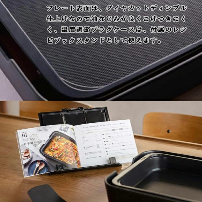「焼く」「煮る」ができる深さ4cmの「深型プレート」、プレート表面は、ダイヤカットディンプル仕上げなので油なじみが良くこげつきにくく、温度調節プラグケースは、レシピブックスタンドとして使えます。※デザイン及び商品内容が変更になる場合がございますので予めご了承下さい。
