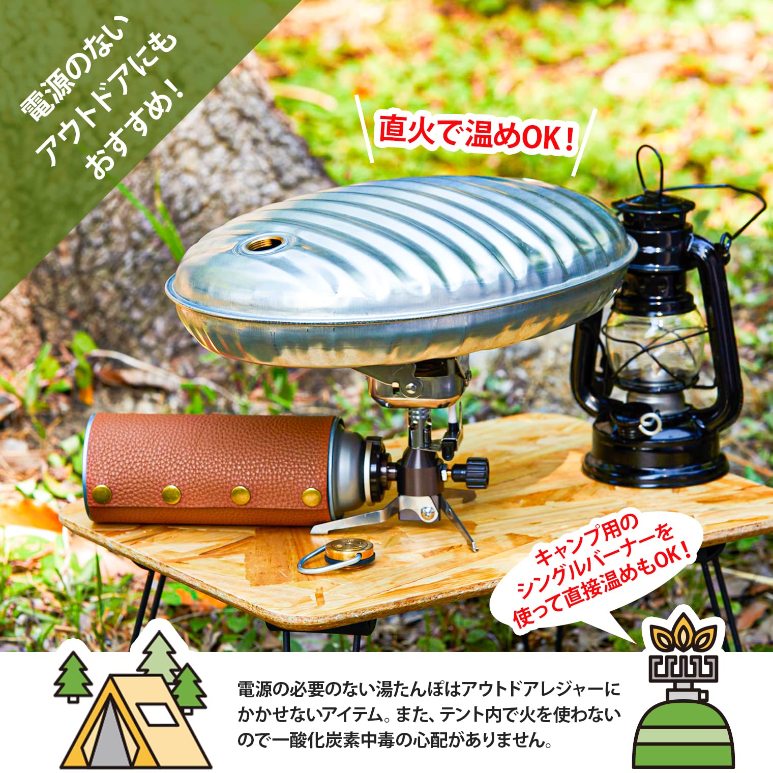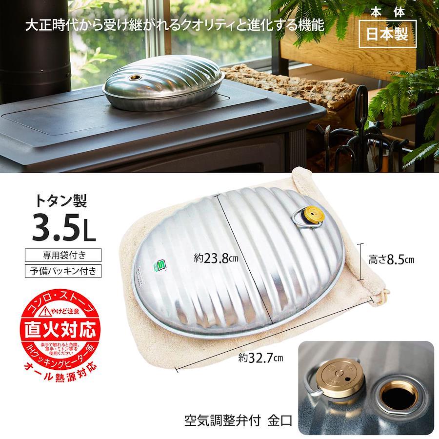 ●肌が乾燥しにくく、身体に優しい暖かさ●底がフラットで安定し注湯がしやすい●IHヒーターで暖め可能●内部に支柱がありへこみに強い●容量:3.5リットル