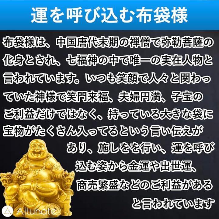 「金運アップに最適」布袋様が持っている大きな袋に宝物がたくさん入ってるという言い伝えがあり、施しをを行い、運を呼び込む姿から金運や出世運、商売繁盛などのご利益があると言われています。