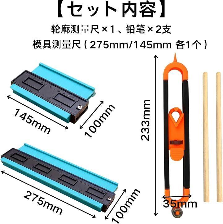スペックと内容物詳細 「セット内容」型取りゲージ(275mm/145mm 各1個)、輪郭ゲージx1、鉛筆x2本 「素材」ABS樹脂+金属 「サイズ」275x100mm/145x100mm/輪郭ゲージ:233x35mm 「特長」目盛付き、ズレ防止構造、ペンシルホルダー付き