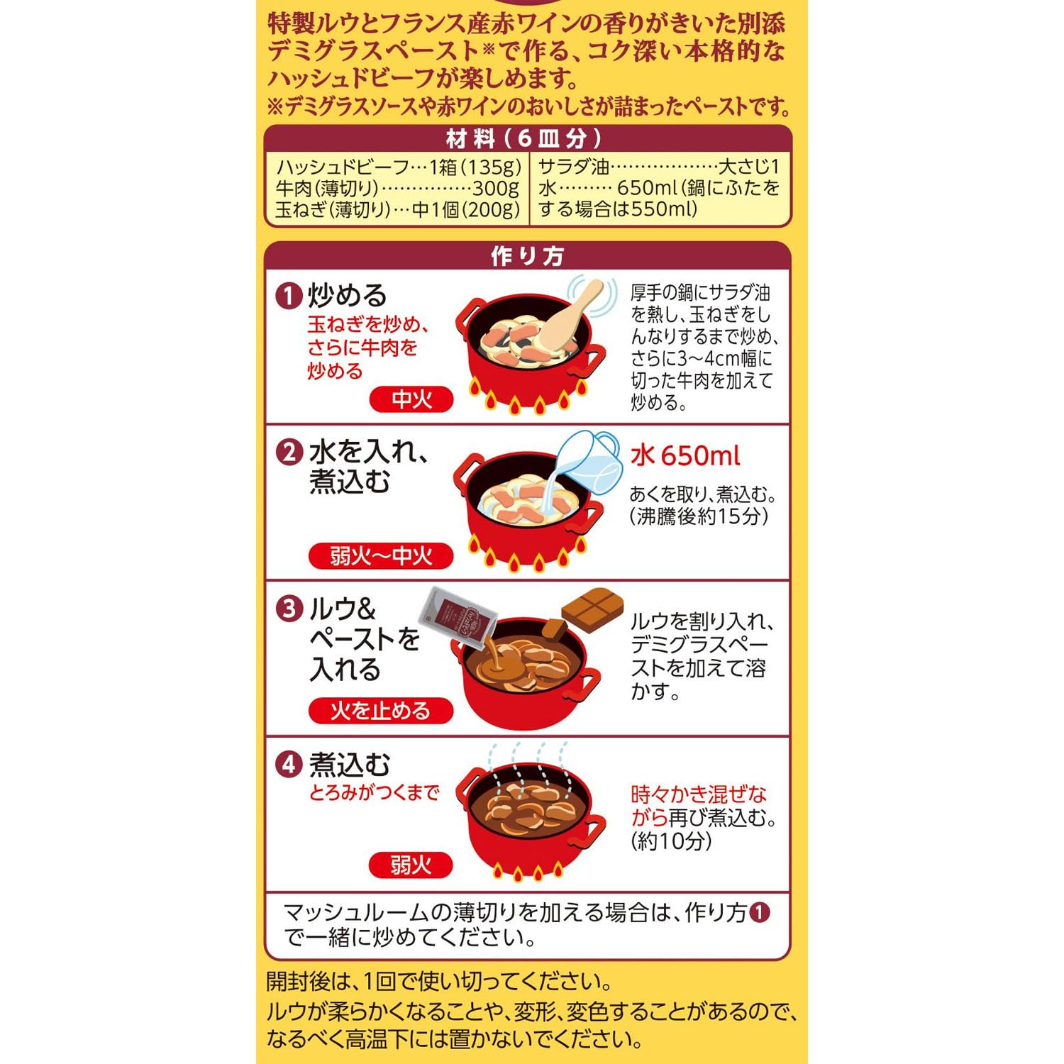 「ハッシュドビーフ 135g」は、ボルドー産赤ワインとフォンブルンの香りとコクが活きた特製デミグラスソース(別添)とブラウンルウで作る、本格的なハッシュドビーフです。フォンブルンとは、ソースや煮込み料理のベースとなるだし汁の一つ。牛肉(薄切り)、玉ねぎなどお好みの具を入れてお召し上がりください。135g(6皿分)。作り方●材料(6皿分)ハッシュドビーフ・・・1箱(135g)牛肉(薄切り)・・・300g玉ねぎ・・・中1個(200g)サラダ油(またはバター)・・・大さじ1水・・・650ml(3・1/4カップ)1.厚手の鍋にサラダ油を熱し、薄切りにした玉ねぎをしんなりするまでいため、さらに3-4cm幅に切った牛肉を加えていためます。2.水を加え、沸騰したらあくを取り、弱火から中火で約15分煮込みます。3.いったん火を止めてルウを割り入れ、特製デミグラスソースを加えて再び弱火でとろみがつくまで約10分煮込みます。*マッシュルームの薄切りを加えたり、ゆでたパスタにかけてもおいしく召し上がれます。
