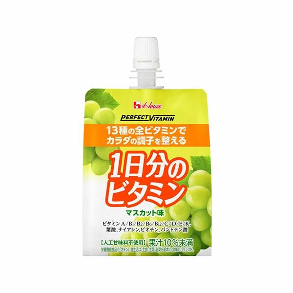 忙しく不規則な生活で食事が乱れがちな時など、十分に摂りきれないビタミン全13種を一度に摂ることができる「1日分のビタミンゼリー」のマスカット味です。スッキリした甘みとほどよい酸味、人工甘味料不使用で果実らしいおいしさ。デザートやおやつにおすすめです。栄養機能食品(ビオチン)。人工甘味料不使用。