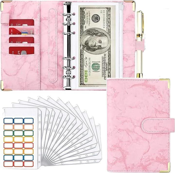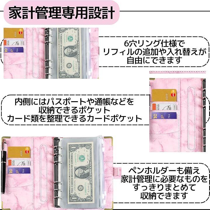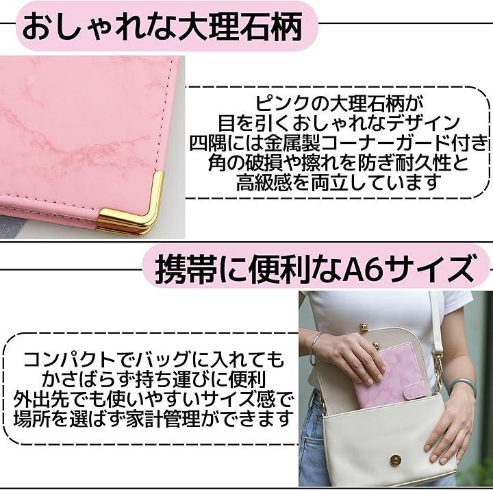 「おしゃれな大理石柄」ピンクの大理石柄が目を引くおしゃれなデザインで、毎日の家計管理が楽しくなります。