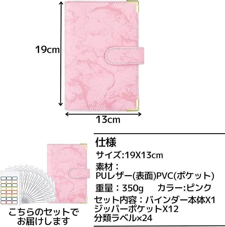 「商品スペック」サイズ:19X13cm、重量:350g、素材:PUレザー(表面)、PVC(ポケット)、セット内容:バインダー本体X1、ジッパーポケットX12枚、分類ラベルx24枚