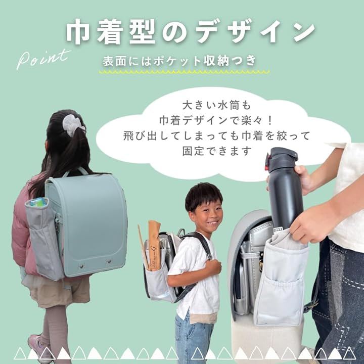 hugmuu 撥水 ランドセル用サイドバッグ 巾着タイプで出し入れ楽々。上履き入れに体操服、給食着…お子さんがたくさんの荷物を持つのは大変ですよね?現役小学生ママの開発者が考案した、ランドセル用サイドバッグ。シンプルなデザインで上部は巾着ですっきり。ランドセルからはみ出すことはないので、目立ちすぎず、荷物をまとめられます。