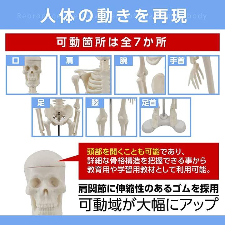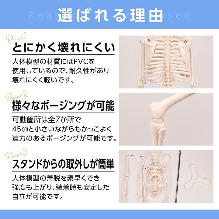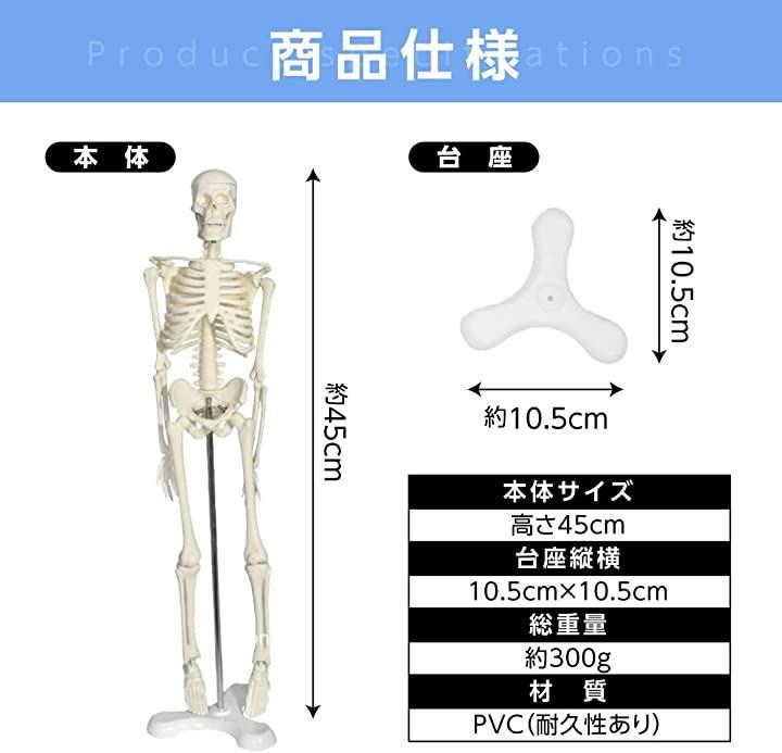 ・「商品仕様」サイズ:高さ45cm 、台座縦横:10.5cmx10.5cm 総重量 約300g 材質:PVC(耐久性あり)机上や本棚など狭小空間でも骨格模型を設置可能です。