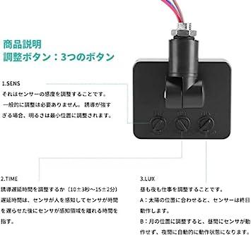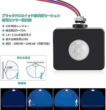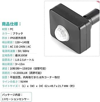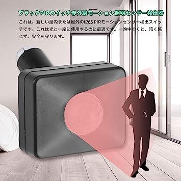 【赤外線センサースイッチについて】仕様:材質:PC。カラー:ブラック。防水:IP65屋外使用。検出範囲:120?140度。電源:AC 110-240V / AC。電源周波数:50 / 60Hz。定格負荷:最大100W。設置高さ:1.8-2.5メートル。検出範