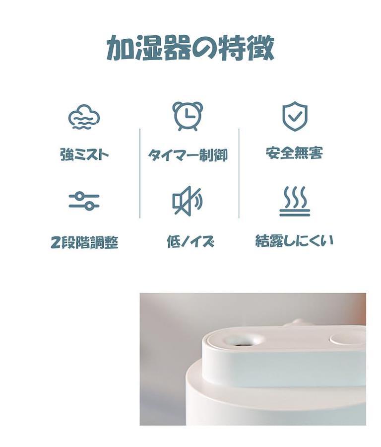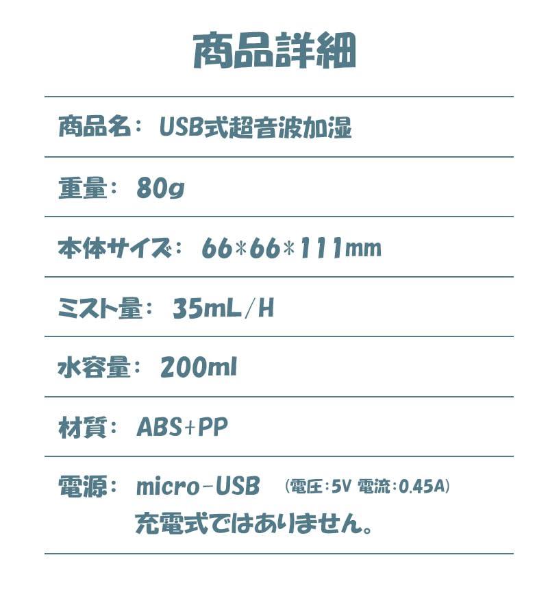 通常1-5営業日で発送:商品名:コンパクトUSB超音波式加湿器素材:ABS/PP生産国:中国出力:5V/0.45A容量:200mL噴射量:約35mL/Hサイズ:約 66 x 66 x 111 mm重量:87g付属品:本体、フィルター(予備1本)、USBコード注意事項: ●ウォーターサーバー(ミネラルウォーター)は雑菌が繁殖しやすく、含まれているミネラル分が加湿器以内のタンクにとどまり汚れやミネラル分が蒸気の部分につまって故障の原因となります。水道水は塩素が含まれ、雑菌が繁殖しにくい特性を持っていますので【水道水】をご使用ください。●平らな場所でご使用ください。●電源部が濡れていないか必ずご確認下さい。また、濡れた手でプラグ等を触らないで下さい。●アロマオイルは水溶性をご使用ください。●長期間使用しないときは、本体タンク部分やフィルターをよく乾かしてから保管してください。●輸入品のため、パッケージに多少のキズや汚れがある場合がございます。●充電式ではございません、ご注意ください。●初回使用、長期間放置後に使用する場合は、フィルターをよく濡らしてからセットしご使用ください。●電