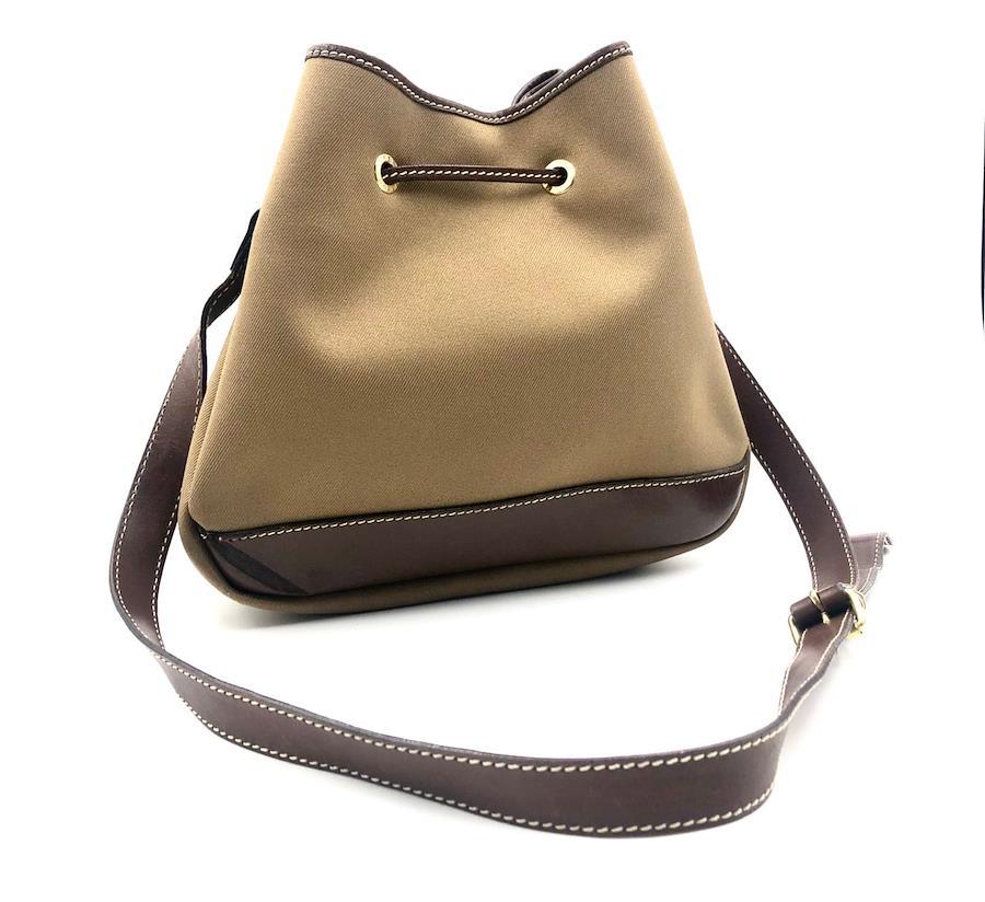 Hunting World Canvas and Leather Drawstring Shoulder Bag, Brown, Logo Plate, All-Over Logo Interior, Gold Hardware, Made in Italy, Engraved, Crossbody