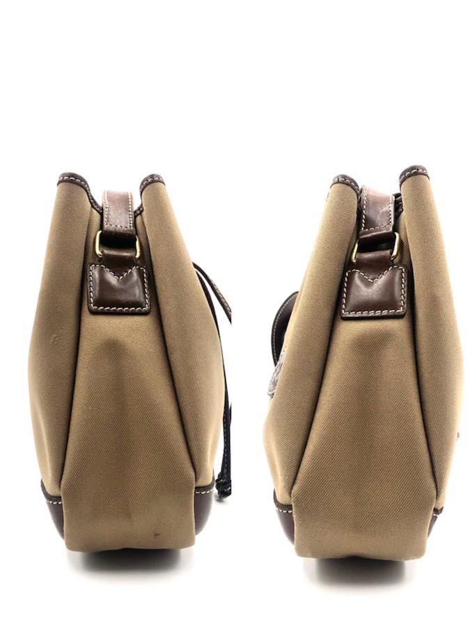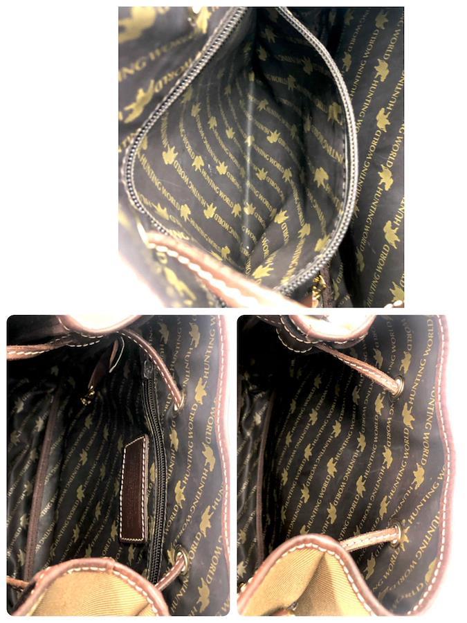 ■商品概要Hunting World ハンティングワールドキャンバス×レザー巾着ショルダーバッグロゴプレートブラウン 内側ロゴ総柄ゴールド金具イタリア製刻印あり斜めがけ クロスボディ