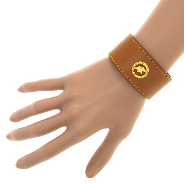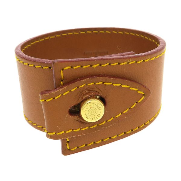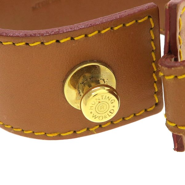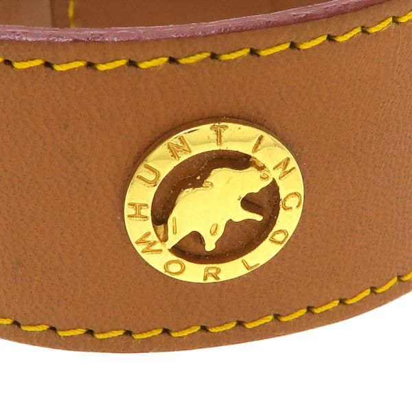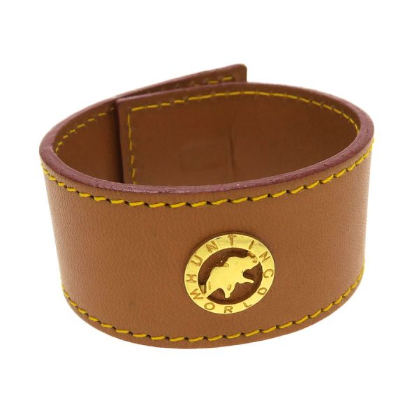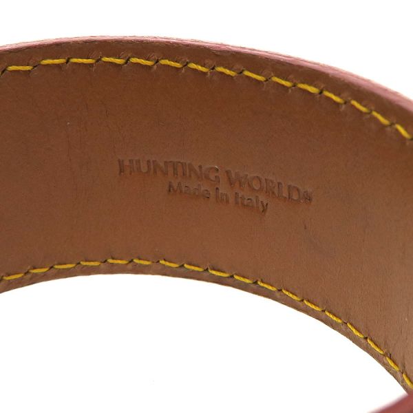 ハンティングワールドのレザーブレスレットのご紹介です!上質なレザーにイエローのステッチ、ゴールドのロゴがアクセントになったブレスレットです。☆状態は、本体の型崩れ、表面のスレ・シワ、ベルト穴のスレ・ヨレ、内側のスレ・汚れ、金具の小傷・くすみ・メッキ?げなどが見受けられますが、まだまだご愛用いただけますよ♪