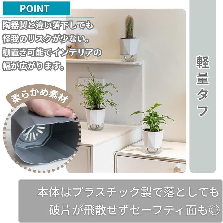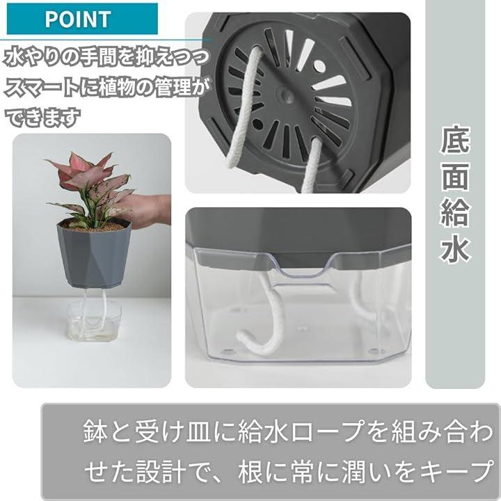 「底面給水」鉢と受け皿に給水ロープを組み合わせた設計で、根に常に潤いをキープ。