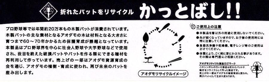 本製品はプロ野球界を中心に社会人野球や大学野球などで使用され、役目を終えた破損バットやバットを作る際にできる端材を再利用し作っています。