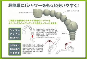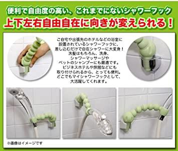 既存のシャワーフックに差し込みだけで、より自由な位置、方向が選べます。日常の入浴を快適にし、入浴の際の様々な不便さを解消します。誰でも簡単に差し込むだけで使えます。差込部は様々なフックに合うようにラバーがはめ込まれています。(サイズが合わない場合は、付属のアタッチメントを差し込んで調整が可能です)両手が自由に使えます。(前後片側 約80度、左右片側 約60度)
