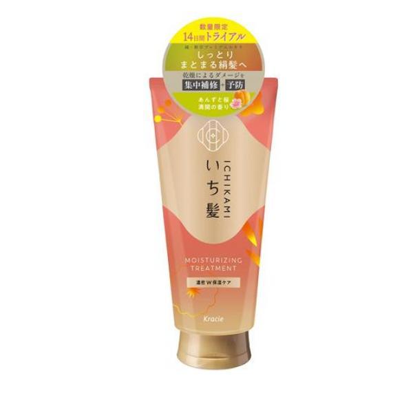 製品の特徴●クラシエ いち髪 濃密W保湿ケア トリートメント ICHIKAMI MOISTURIZING TREATMENT●「日本の髪を本質から考える(*1)。」ヘアケアブランド。●日本の髪研究から生まれた「和草のちから」でダメージを補修&予防する「予防美髪」ケアシリーズ。●補修&予防成分「高濃度(*2)純・和草プレミアムエキス(*3)」配合。●「髪の透明感(*4)」×「絹のような手触り」で、見ても、ふれても、感動する絹髪へ。●パサつき、広がりが気になる髪も、しっとりまとまる絹髪へ導きます。●モイストチャージ処方。●特に傷みが気になる髪に、集中補修ケア。●髪と地肌をW保湿、乾燥によるダメージを補修+予防。●サルフェートフリー(*5)処方。●ほろ甘いあんずと上品な桜 満開の香り。●販売名:いち髪 MトリートメントE〈ヘアトリートメント〉