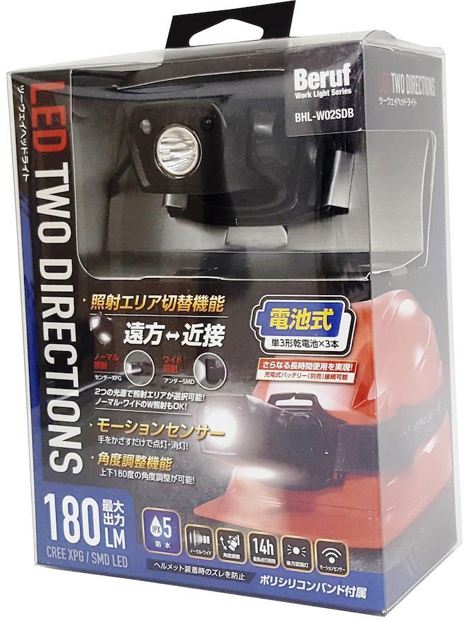 照射エリア切替で2つの光源で照射エリアを選択できる。W照射できる。モーションセンサー搭載で手をかざすだけで点灯消灯できる。角度調整機能で下方180度の角度調整が可能。使用電源:単三形アルカリ乾電池×3本光源:センター/Cree XPG×1個、アンダー/SMD LED×1個明るさ:センター/約180ルーメン、アンダー/約160ルーメン点灯時間:センター/約11時間、アンダー/約14時間、全点灯/約8時間照射特性:ノーマル、ワイド防水性能:IPX5使用環境温度:-5~40度付属品:ポリシリコンバンド×1、単三形乾電池×3別売バッテリー:87691充電バッテリー使用可能