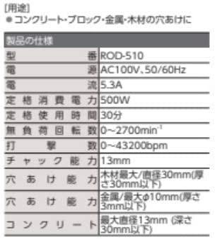 通常1-5営業日で発送:イチネンアクセス(旧イチネンミツトモ) RELIEF(リリーフ) 電動工具 ROD-510 振動ドリル 82404 電気ドリル兼用型