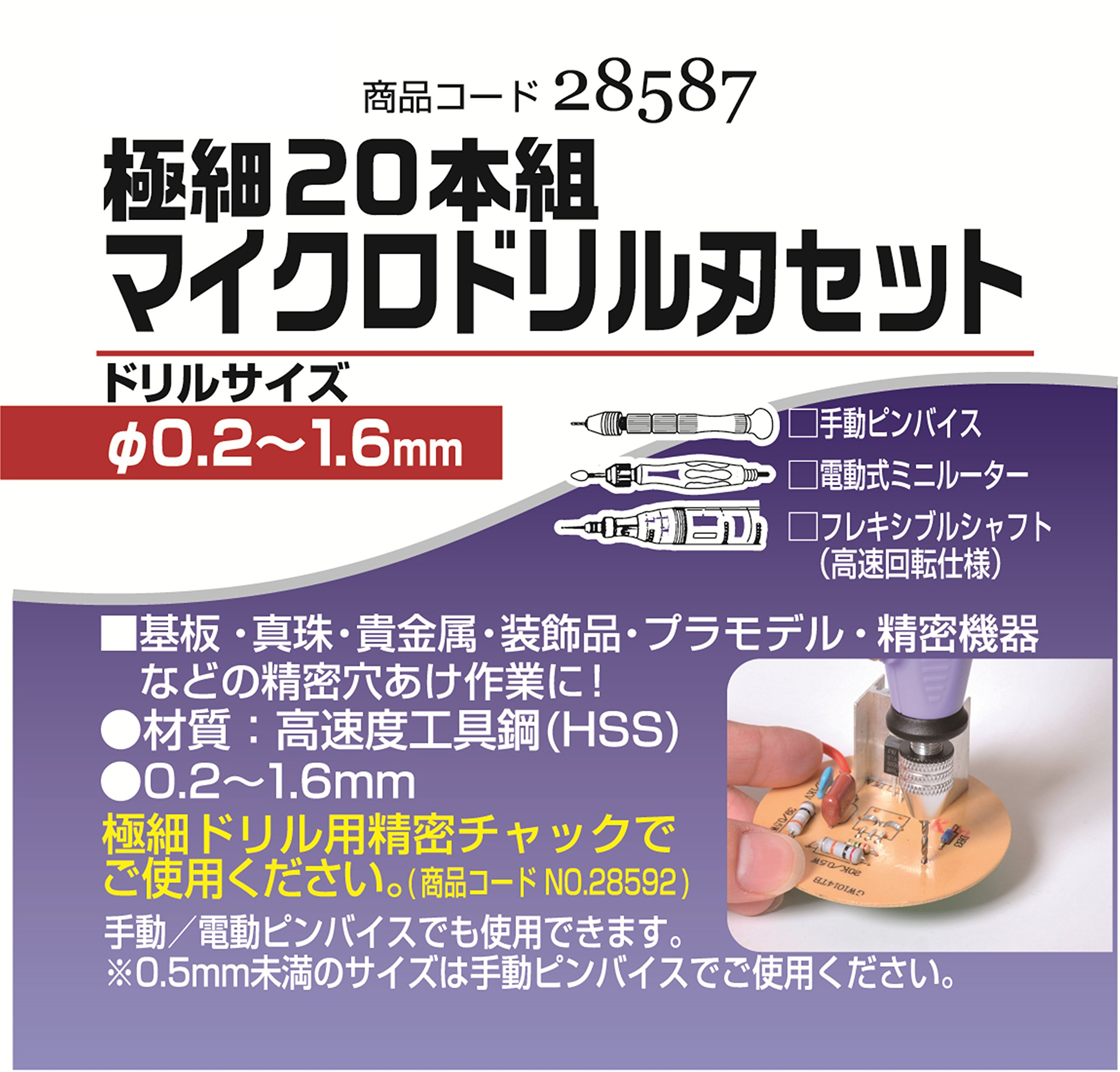 20本組先端サイズ:0.2-1.6mm材質:HSS (ハイス)鋼使用機種:手動ピンバイス、電動式ミニルーター、フレキシブルシャフト(高速回転仕様)用途:基盤、真珠、貴金属、装飾品、プラモデル、精密機器などの精密穴あけ作業に。