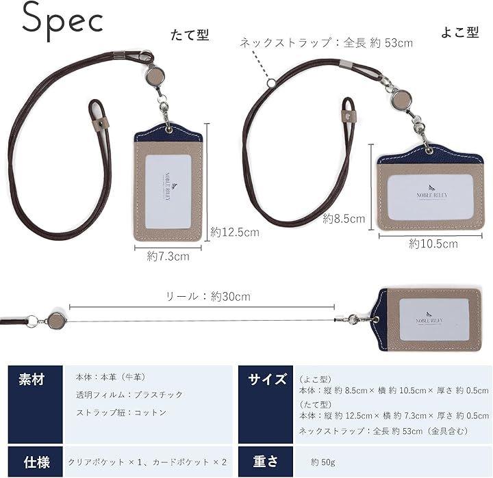 「SPEC」*素材 本体:本革(牛革) 透明フィルム:プラスチック、ストラップ紐:コットン *仕様 クリアポケットx1、カードポケットx2 *サイズ (よこ型)本体:縦 約 8.5cmx横 約 10.5cmx厚さ 約 0.5cm (たて型)本体:縦 約 12.5cmx横 約 7.3cmx厚さ 約 0.5cm ネックストラップ:全長 約 53cm(金具含む) *重さ:約 50g
