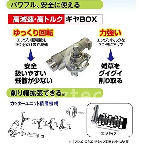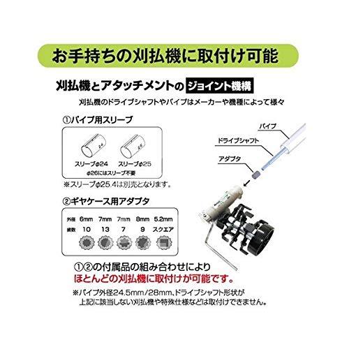 《仕様》 寸法 全長×全幅×全高(mm):202×270×140 質量(kg)※ギヤケース含む:2.1 削り幅(W):200mm 減速方式(減速比):ウォームギヤ式1/30 用途:畑・庭・グラウンドの草削り(軽、中作業) 付属品:取付けKIT