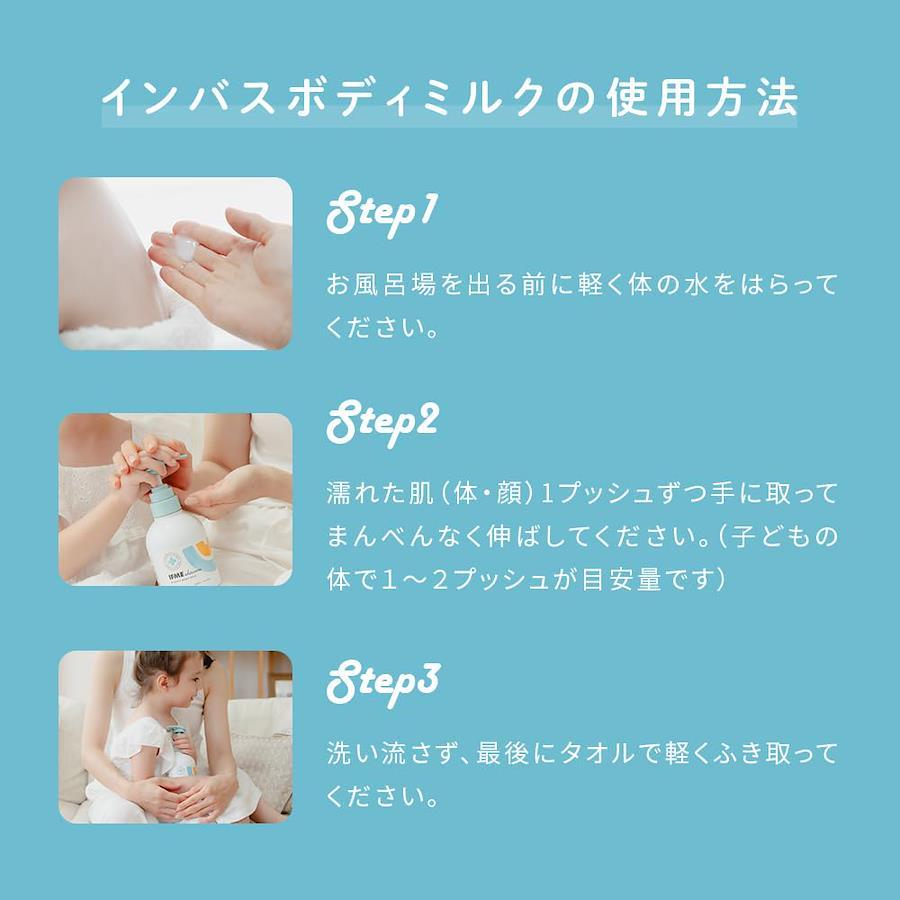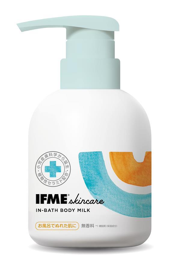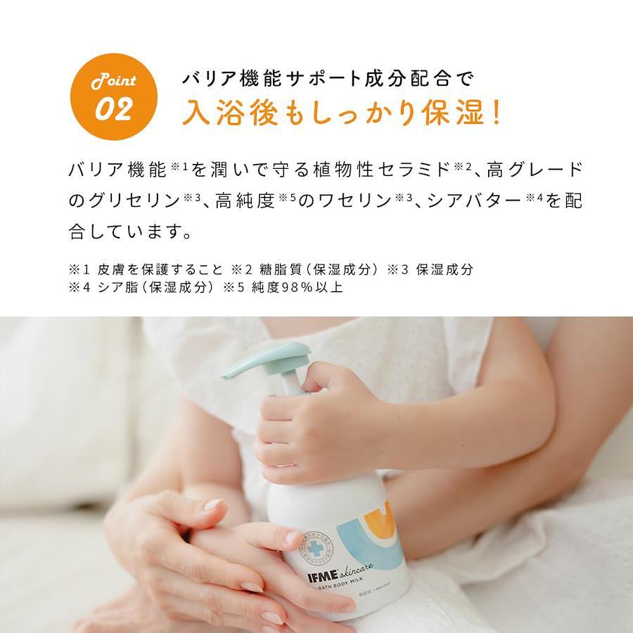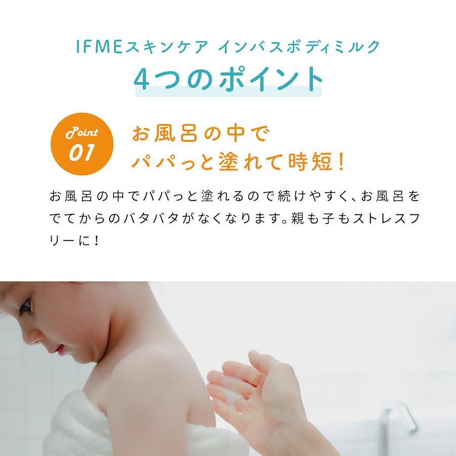 ?【 素肌をやさしく守る植物性セラミド配合!ぷるっともちもちの肌に】肌本来の潤い成分のように働くセラミドがバリア機能をサポート。高グレードのグリセリン、高純度のワセリン、シアバターを配合、肌をすこやかに保ちます。0歳の赤ちゃん(新生児)からこども、敏感肌の大人の方までご家族でお使いいただけます。 ?【 新感覚!お風呂で塗れるインバスタイプ】IFMEボディミルクはお風呂の中で濡れたままの肌に塗るインバスタイプ、お風呂上りの急激な乾燥から素肌を守ります。毎日手軽に続けやすいから、スキンケアが習慣化します。 ?【抜群の使用感。 塗りやすく、ベタつかない】やわらかく伸ばしやすいテクスチャーだから、角質層内部まですーっと浸透。ベタつかずにさっぱりと馴染むので、活動期の赤ちゃんや子供にも使いやすいミルクタイプ。 ?【忙しいママ・パパにオススメ】お風呂タイムにサッと塗ってタオルで拭くだけの時短スキンケア。乾燥や肌荒れが気になるけど忙しい家族にピッタリ。たっぷり使える300mlの大容量。 ?【アレルギーテスト・敏感肌パッチテスト済みの安心成分】子どもの成長を研究し続けているIFMEだからこそ実現した、親子の素肌を潤いで守るこだわりの処方。小児皮膚科学に基づいた成分を配合し各種テスト済み(アレルギーテスト、敏感肌パッチテスト済み・アルコールフリー・パラベンフリー・動物性原料フリー・無香料)