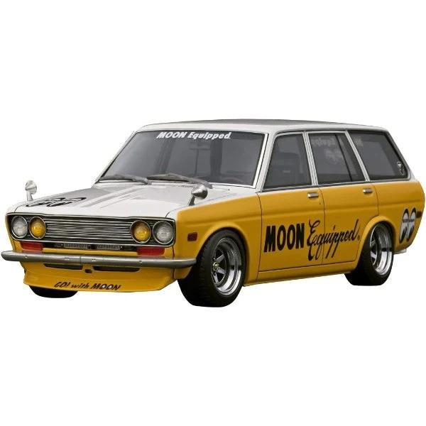 TARMACWORKS × ignition model 1/18 ダットサン Bluebird (510) Wagon Yellow/White 完成品 TARMACWORKS × ignition model 1/18スケール、レジン製ミニカー。ターマックワークス企画、イグニッションモデル製作の特注モデル。人気のムーンアイズカラーのダットサン ブルーバード 510ワゴンを1/18スケール レジンモデルで再現。ボディカラー:イエロー/ホワイト。ロンシャンタイプ 14インチホイール装着。前期型フロントグリルにフロントリップスポイラー、ローダウン仕様。ボディ各所にムーンアイズのロゴをデカール再現し、フロントライトのイエローカバーやリヤバンパーレスのアメリカンスタイルな雰囲気です。内装はウッドステアリングに運転席のみバケットシートを装着した左ハンドル仕様。パッケージは背景紙に「ターマックワークス」&「ムーンアイズ」ロゴを配した特注バージョンです。