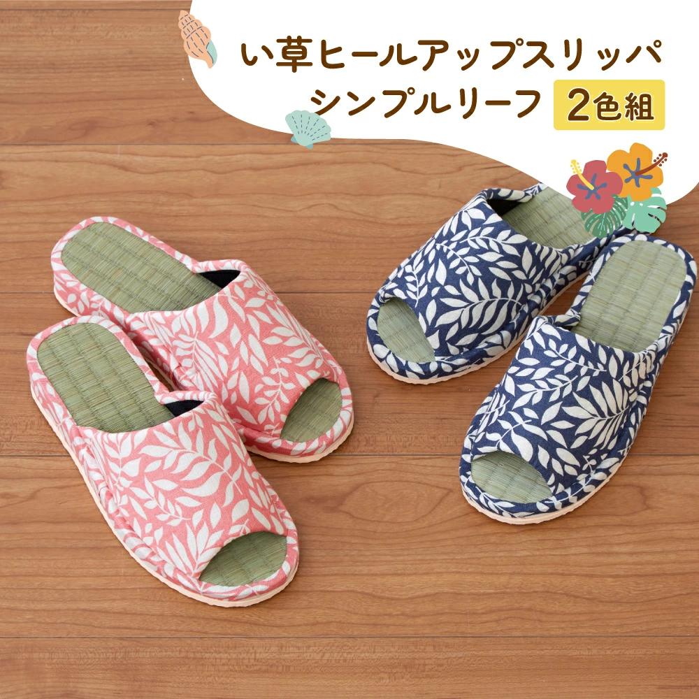 サイズ:全長/約25cm、ヒール高/約3.5cm、適応サイズ/約22~24cm材質:生地/ポリエステル中敷/い草中材・底材/EVA樹脂●シンプルな大人テイストのリーフ柄スリッパです●サラッと履き心地の良い、い草を使用●ほど良いヒール高のヒールアップタイプ●ピンク系・ネイビー系の2色組天然素材を使用しておりますので、い草特有の香りが致します。【ご注意】本品は、天然素材を使用しておりますので、保管場所の環境や天候の変化によってはカビが発生する可能性があります。下駄箱や玄関や室内であっても天候の変化等により高温多湿になる場所ではカビが発生する可能性がございますので十分に注意をして保管してください。長くご愛用いただく為にも定期的に確認していただき、風通しの良い場所での陰干しをお勧めいたします。保管の際には同封しております乾燥材を入れ、密封していただけますとカビが発生しにくくなります。乾燥材は水等に濡らさないようにしてください。※幅・甲の高さなど個人差がありますのできつく感じる場合があります。