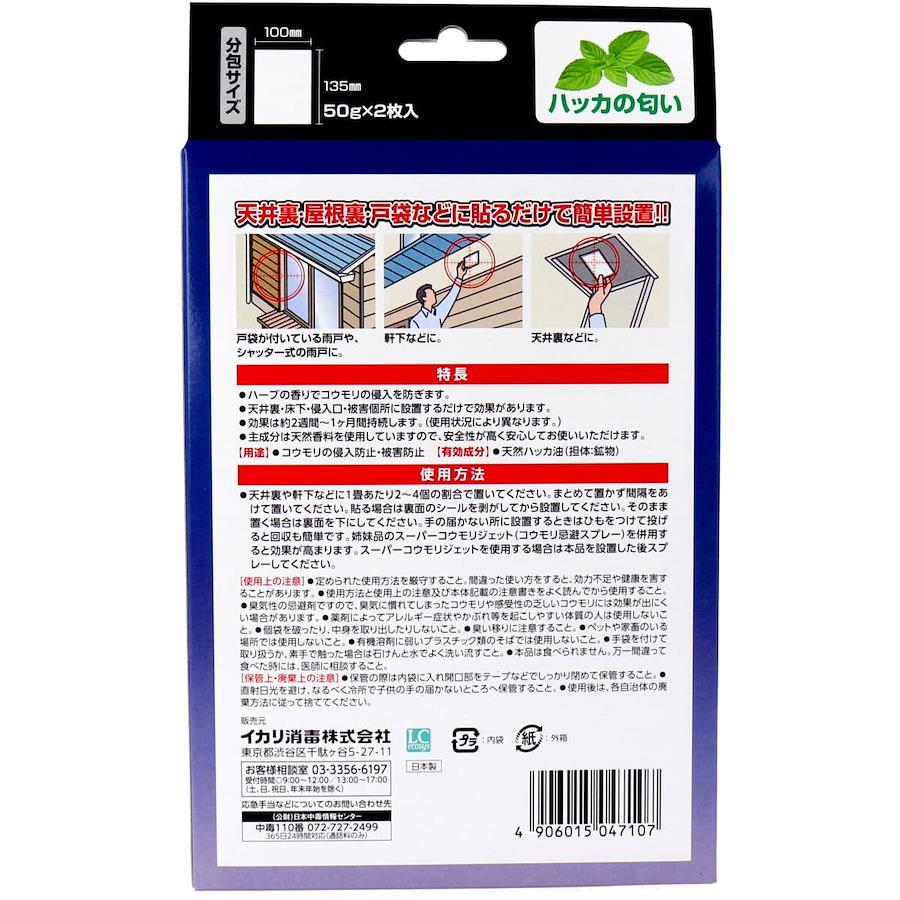 【使用方法】・天井裏や軒下などに1畳あたり2~4個の割合で置いてください。まとめて置かず間隔をあけて置いてください。・貼る場合は裏面のシールを剥がしてから設置してください。・そのまま置く場合は裏面を下にしてください。・手の届かない所に設置するときはひもをつけて投げると回収も簡単です。