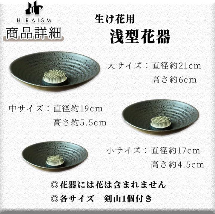 「商品内容」生け花用花器 大:直径21cmx高さ6cm 中:直径19cmx高さ5.5cm 小:直径17cmx高さ4.5cm 大:約620g 中:約490g 小:約400g 備考:剣山1個付き *陶器のため、多少個体差がございます。