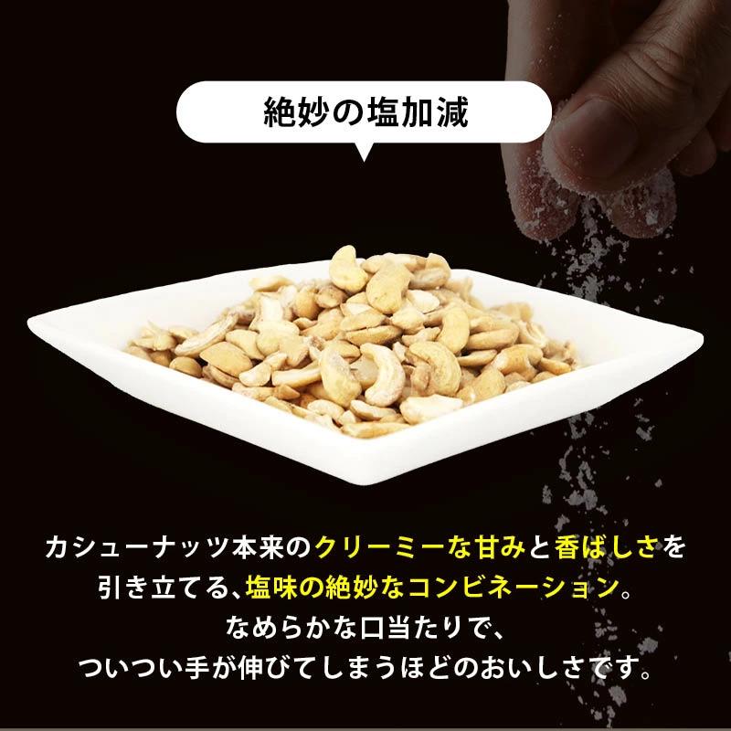 【絶妙な塩加減】カシューナッツ本来のクリーミーな甘みと香ばしさを引き立てる、塩味の絶妙なコンビネーション。なめらかな口当たりで、ついつい手が伸びてしまうほどのおいしさです。