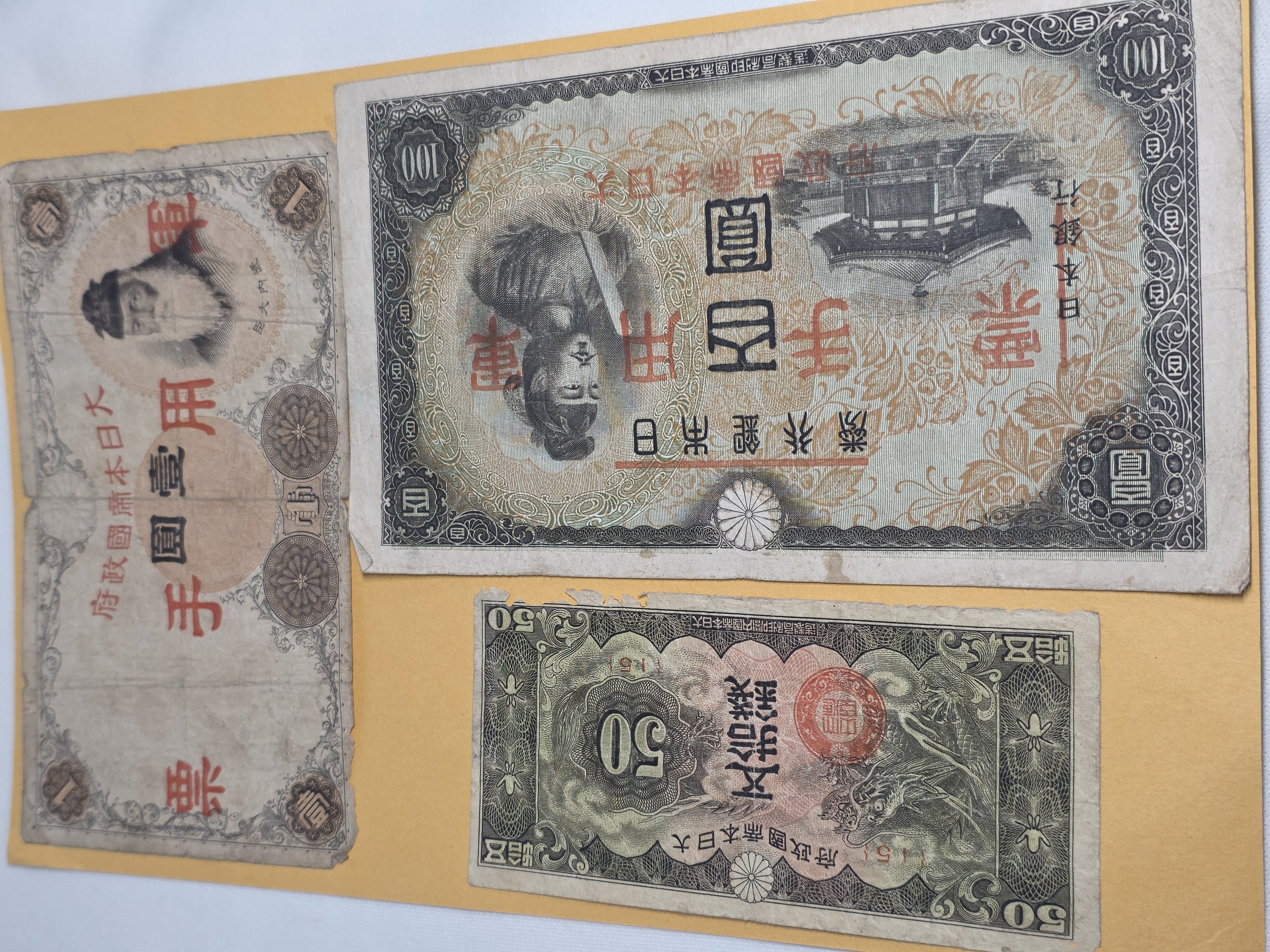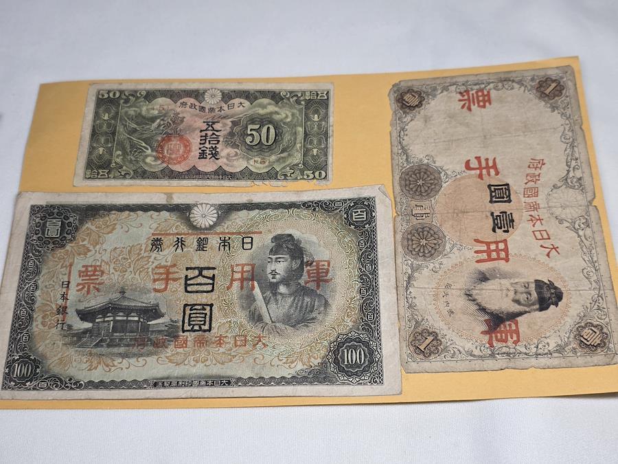日本の古銭になります。オレンジの台紙に貼ってあります。1部分取れています